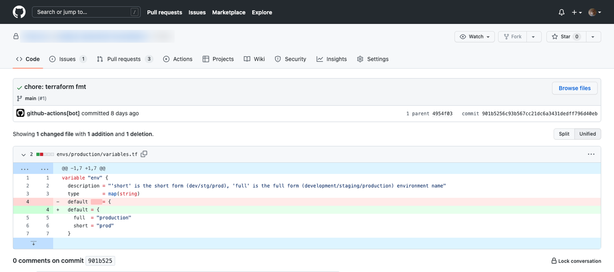 Retty では CI 上で terraform fmt を実行し、差分があった場合にはその修正を自動的に commit & push するようにしています。これはリポジトリを初めて触る人の負荷を軽減するためです。