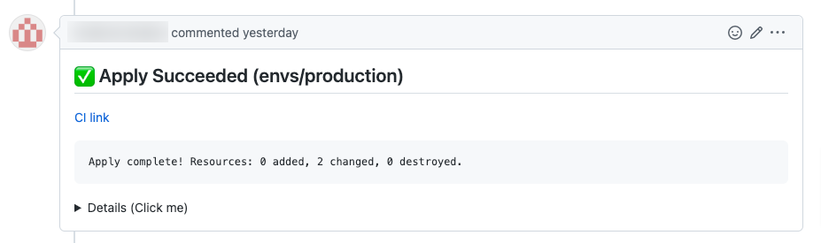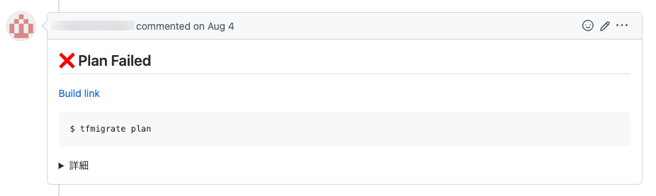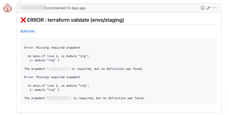 terraform validate でエラーが見つかった際には、github-comment を利用して Terraform を実行したディレクトリと対象の CI へのリンク、実際のエラー内容をコメントとして投稿しています。