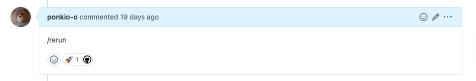 Actions の画面から Re-run することもできますが、目的のワークフローを探すのが手間だったり、Re-run するワークフローの選択ミスを防ぐために PR 上のコメントで Re-run できるようにしました。