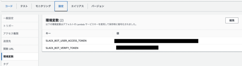 3.の Slack Api 作成時に控えた値を環境背変数として設定します。