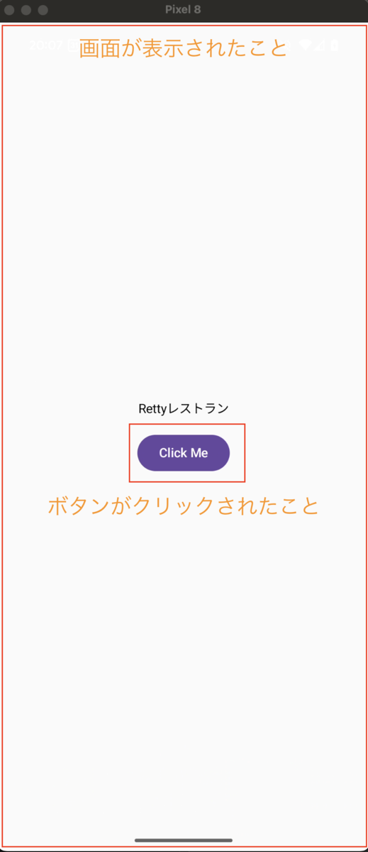 @Composable public fun HogeScreen( modifier: Modifier = Modifier, uiState: HogeUiState, ) { Box( modifier = Modifier .testTag(HogeUiElement.Button.testTag) // タグを埋め込む .fillMaxSize(), contentAlignment = Alignment.Center, ) { Column( horizontalAlignment = Alignment.CenterHorizontally, ) { Text(text = uiState.restaurantName) Spacer(modifier = Modifier.height(16.dp)) Button( modifier = Modifier.testTag(HogeUiElement.Button.testTag), // タグを埋め込む onClick = { uiState.listener.onClick() }, ) { Text(text = "Click Me") } } } }