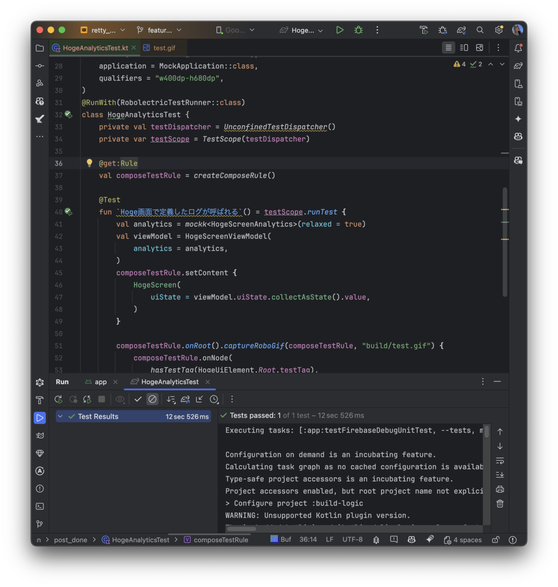 // Robolectricテストの実行環境を設定 @Config( sdk = [Build.VERSION_CODES.VANILLA_ICE_CREAM], // Android 15環境でテストを実行 application = MockApplication::class, // テスト用の軽量なアプリケーションクラスを使用 qualifiers = "w400dp-h680dp", // テストデバイスの画面サイズを指定 ) @RunWith(RobolectricTestRunner::class) // RobolectricでAndroidフレームワークをエミュレート class HogeAnalyticsTest { // コルーチンのテスト用設定 private val testDispatcher = UnconfinedTestDispatcher() private var testScope = TestScope(testDispatcher) // Jetpack Composeのテスト用ルール // UIコンポーネントのレンダリングやインタラクションのテストを可能にする @get:Rule val composeTestRule = createComposeRule() @Test fun `Hoge画面で定義したログが呼ばれる`() = testScope.runTest { // 1. テストの準備 // モックのアナリティクスを作成 val analytics = mockk<HogeScreenAnalytics>(relaxed = true) // テスト対象のViewModelを作成 val viewModel = HogeScreenViewModel( analytics = analytics, ) // 2. テスト対象の画面を表示 // ComposeのテストルールにUIを設定 composeTestRule.setContent { HogeScreen( uiState = viewModel.uiState.collectAsState().value, ) } // 3. テストの実行と検証 // roborazziでUIテストの実行過程をGIFアニメーションとして記録する composeTestRule.onRoot().captureRoboGif(composeTestRule, "build/test.gif") { // 3-1. 画面表示時のページビューログを検証 // Rootノードの存在を確認(画面が表示されていることを確認) composeTestRule.onNode( hasTestTag(HogeUiElement.Root.testTag), ) // onPageView()が1回だけ呼ばれたことを検証 verify(exactly = 1) { analytics.onPageView() } // 3-2. ボタンクリック時のログを検証 // ボタンを見つけてクリックを実行 composeTestRule.onNode( hasTestTag(HogeUiElement.Button.testTag), ).performClick() // onClickButton()が1回だけ呼ばれたことを検証 verify(exactly = 1) { analytics.onClickButton() } } } }